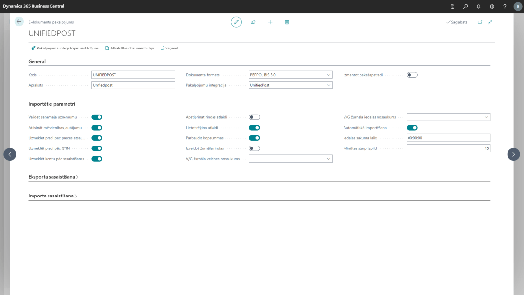 Lietotne nodrošina e-rēķinu apamaiņu risinājumā Business Central ar vietējo e-rēķinu operatoru Unifiedpost.